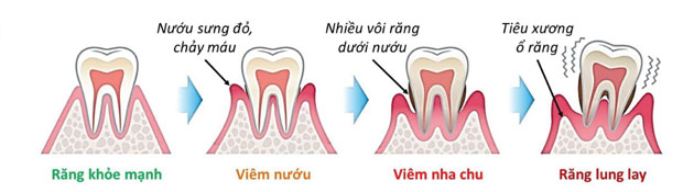 Viêm nha chu xuất hiện khi độc tố do vi khuẩn tiết ra phá hủy mối liên kết giữa các tế bào và xương. Nướu bị tụt và làm lộ chân răng. Mảng bám sẽ xâm lấn vào chân răng. Nướu bung ra khỏi răng, răng lỏng lẻo, dẫn đến mất răng. Chính vì vậy, khi có những dấu hiệu như chảy máu nướu, nướu sưng đỏ, hôi miệng, đau răng... nên đến các phòng khám chuyên khoa răng hàm mặt để khám và điều trị kịp thời.