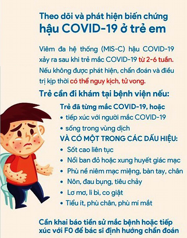 MIS-C là biến chứng nặng, hiếm gặp, là tình trạng viêm đa cơ quan trong cơ thể bao gồm tim, phổi, thận, não, da, mắt hoặc các cơ quan tiêu hóa... dẫn đến suy đa cơ quan. MIS-C thường xảy ra sau nhiễm Covid-19 từ 2 - 6 tuần, sốt liên tục từ 3 ngày trở đi kèm theo các dấu hiệu: Tổn thương da, nổi ban, đỏ mắt, môi đỏ, lưỡi đỏ như da trái dâu tây, phù nề bàn tay, bàn chân; rối loạn tiêu hóa: Đau bụng, tiêu chảy, ói; dấu hiệu suy tim: Mệt, xanh, môi tái, lạnh tay chân. MIS-C có thể gây nhiều biến chứng xấu, khiến trẻ có thể tử vong nếu không được điều trị kịp thời.